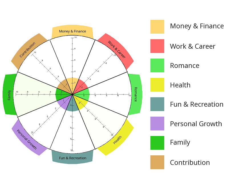 You can modify the category names to suit your own needs. For each category, enter a value from 0 - 10 indicating how satisfied you are with that area of your life right now. When you're happy with the values, Click Create My Chart to create your own.